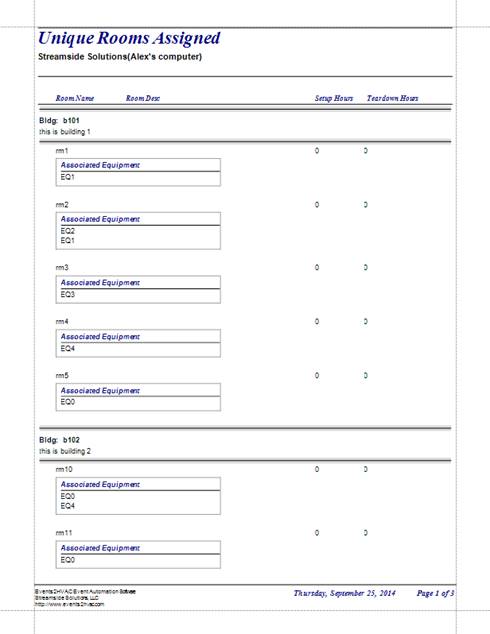 The Unique Rooms Assigned Report lists all the rooms that are presently mapped to an equipment item. Rooms are grouped by building, and can be displayed with or without a list of the associated equipment items for each room using the parameter pane. No information on equipment actions is provided.