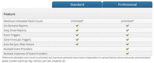 Standard users can upgrade at any time to Professional with a license change. The Professional license will include a limit on the maximum number of event provider instances available. Both editions use the same room license limits across however many active event providers and equipment items are in use (enabled).