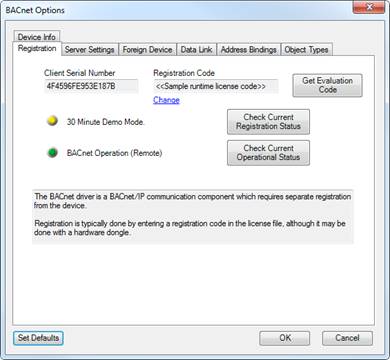 The registration tab shows information related to the registration and operation of the BACnet client driver. This device interface requires a 3rd party client license to operate outside of the evaluation mode.