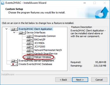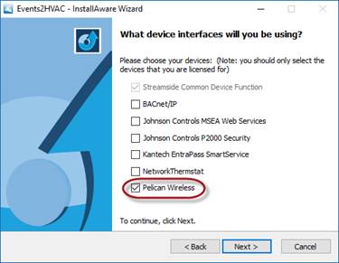 After running the setup installation file for Events2HVAC, when you get to the device interface page, make sure the Pelican Wireless option is selected as shown below. (Founten users will select Pelican Wireless as well.)