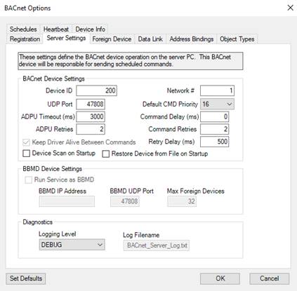 If you want the server BACnet client to operate as a BBMD (BACnet/IP Broadcast Management Device), check the “Run Service as a BBMD” check box and fill in the appropriate BBMD settings. When this option is checked, the “Keep Driver Alive Between Commands” checkbox is forced to be checked. When the server is operating as a BBMD, the BACnet driver needs to be running so other clients can register to it.