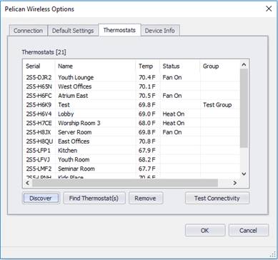 The Thermostats tab shows all the thermostats that have been discovered from the Pelican Wireless system. Initially this will be blank. You must manually discover the thermostats using the Find Thermostats button.