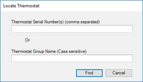 Click the Find Thermostats button to discover thermostats. You can either enter a comma-separated list of serial number or search for groups.