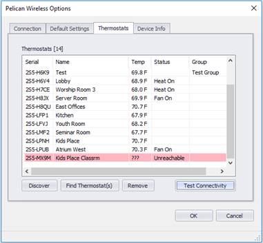 Click the Test Connectivity button to query all the thermostats selected and update them with live data. If a thermostat returns an error or if the thermostat is “unreachable” the row will be highlighted in light red.